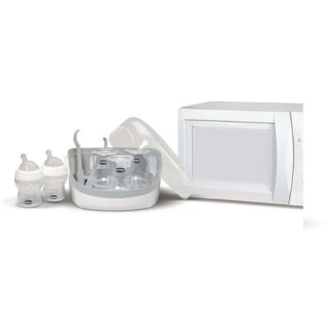 Lo Sterilizzatore per Microonde di Chicco è utile per sterilizzare a vapore biberon, tettarelle, succhietti e altri piccoli oggetti in modo rapido, efficace e sicuro. Basta riempire d’acqua lo sterilizzatore e inserirlo nel microonde per 3 minuti a 1200 W. In pochi istanti avrete eliminato il 99,9% di germi e batteri e lo manterrete pulito e igienizzato fino a 24 ore dopo la sterilizzazione. Può contenere fino a 5 biberon (marca Chicco) contemporaneamente, inoltre è fornito di pinze igeniche da utilizzare per sollevare gli oggetti una volta terminato il processo di sterilizzazione, evitando così possibili ustioni.