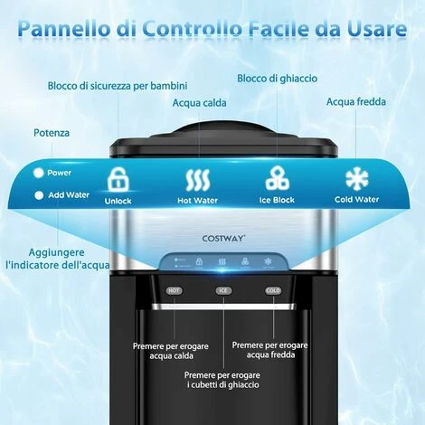 Il nostro erogatore dell’acqua 3 in 1 con macchina del ghiaccio incorporata è un elettrodomestico pratico da usare tutto l’anno. Offre 3 temperature per avere acqua calda in inverno e fredda in estate. Oltre a esse, potrai avere cubetti di ghiaccio a forma di protettile con un clic sul pannello di controllo. È facile riempire il serbatoio dell’acqua con la caraffa che contiene 10-20 L o aggiungendola manualmente. Quado il serbatoio è privo di acqua, l’indicatore ti ricorderà di riempirlo. Inoltre, il blocco per bambini offre un’ottima protezione per tutta la famiglia.