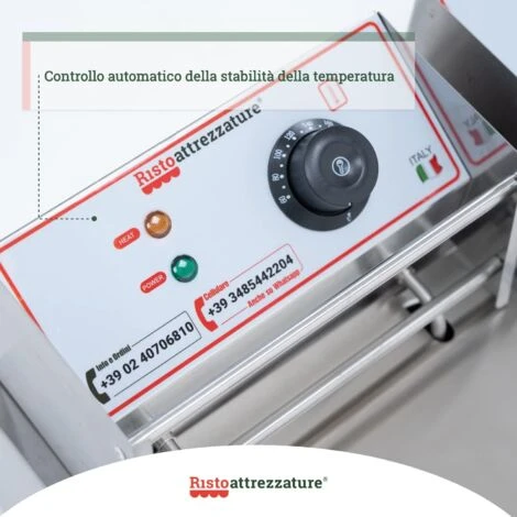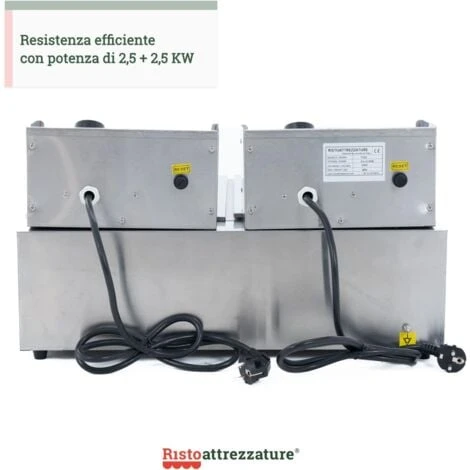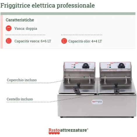 La friggitrice 2 vasche è caratterizzata da una resistenza di 2.5 +2.5 kW che rende possibile un rapido riscaldamento dell’olio fino ad alte temperature. Ristoattrezzature ha inoltre dotato le sue friggitrici due vasche di un termostato in grado di regolare la temperatura e mantenerla sempre costante e stabile in modo completamente automatico. Le friggitrici a due vasche sono l’esempio perfetto della combinazione ideale di qualità, efficienza e prezzi contenuti che si rivela ottimale per qualsiasi attività impegnata nella gastronomia e pasticceria.