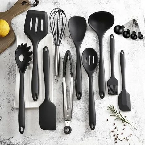 - 1. 【Set completo con 14 pezzi】 Gli utensili da cucina contengono frullino per le uova, pennello, raschietto grande, raschietto piccolo, cucchiaio, pinze da cucina, cucchiaio di drenaggio, polvere antigoccia, una spatola per burro, un cucchiaio drenante, un cucchiaio nero , 12 ganci a S, 5 misurini e scatola portaoggetti, i nostri 14 diversi utensili in silicone ti offrono tutti gli strumenti per completare i tuoi piatti e rendere la cottura molto più semplice.