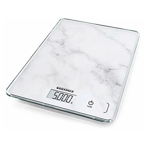 Portare e 5 kg. graduazione 1g. Aspetto marmo naturale. Schermo LCD da 12 mm. Sistema brevettato Sensor Touch. Funzione di spegnimento automatico. Funzione di tara. Piedini antiscivolo. Design extra piatto e compatto. Batterie incluse.