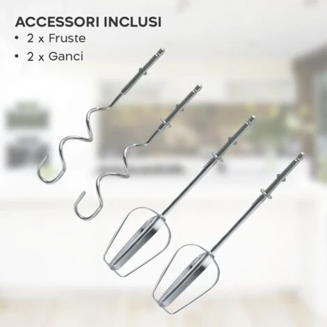 Ciò che non può mancare in cucina è sicuramente uno sbattitore elettrico. Questo modello ha 7 regolazioni di velocità, puoi amalgamare uno o più ingredienti contemporaneamente. Dispone di 2 tipi di fruste: 2 fruste a ganci, ovvero quelle classiche che servono per montare la panna, le uova, per sbattere e per amalgamare gli impasti. Mentre, le fruste a spirale sono da utilizzare per lavorare gli impasti particolarmente corposi e duri come, per esempio, quello del pane o della pizza.