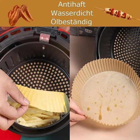 La carta per friggitrice ad aria è resistente al calore fino a 428 gradi Fahrenheit / 220 gradi Celsius e può essere utilizzata in friggitrici ad aria, forni convenzionali e forni a microonde.
